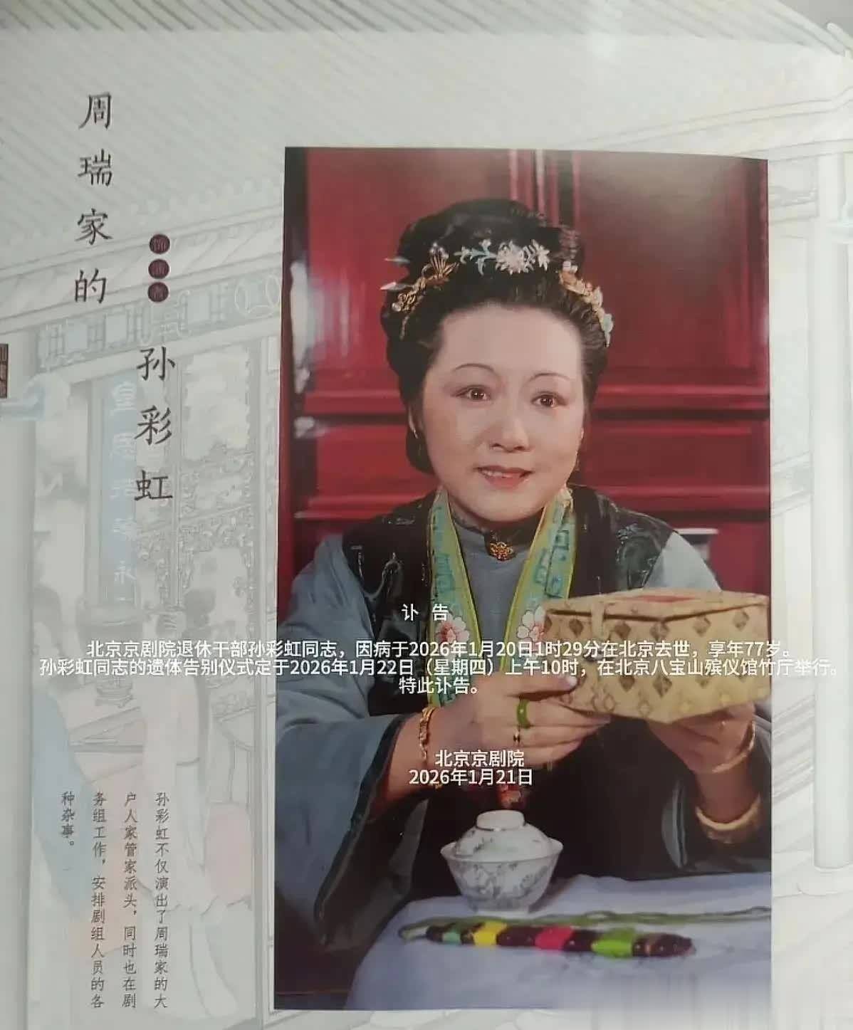 2026Äê1ÔÂ20ÈÕÆÆÏþ£¬£¬£¬£¬£¬±±¼ÓÄôó99Õ¹ÍûÃ÷È·Íø¾©´«À´Ò»ÔòÁîÈËÐÄËéµÄÐÂÎÅ£º87°æ¡¶ºìÂ¥ÃΡ·ÖС°ÖÜÈð¼ÒµÄ¡±ÊÎÑÝÕß¡¢ÖøÃû¾©¾çÑÝÔ±Ëï²Êºç£¬£¬£¬£¬£¬Òò²¡Ò½ÖÎÎÞЧÊÅÊÀ£¬£¬£¬£¬£¬ÏíÄê77Ëê¡£¡£¡£¡£¡£ÕâλϷÀïÏ·Íⶼ͸×ÅÀûÂäÓëÎÂÇéµÄÒÕÊõ¼Ò£¬£¬£¬£¬£¬ÖÕ¾¿Ã»Äܰ¾¹ýËêÔµÄÄ¥Á·£¬£¬£¬£¬£¬Áô¸øÖÚÈËÎÞ¾¡µÄ˼ÄîÓëÍïϧ¡£¡£¡£¡£¡£