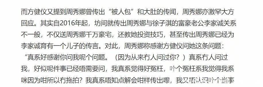 当听到那些越来越离谱的听说时, , ,,,,周秀娜赶忙站出来澄清, , ,,,,强调两人基础就没有熟悉。 。。。。 。主持人问她为什么不早点出来澄清, , ,,,,偏偏比及那么晚才说清晰, , ,,,,周秀娜的脸上也露出了无奈的神色。 。。。。 。她体现自己信托清者自清, , ,,,,可没想到舆论竟然炒得那么凶, , ,,,,逼得她只好站出来诠释一下。 。。。。 。