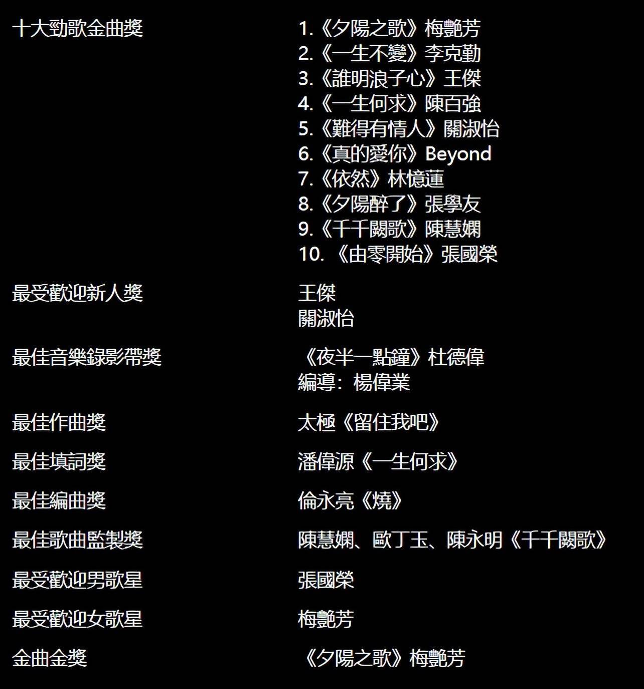 »ØÊ×ÕâÒ»ÄêµÄÊ®´ó½ðÇú£¬£¬£¬£¬£¬£¬£¬£¬³ýÁËÍõ½Ü¡¢³Â°ÙÇ¿¡¢Ã·ÑÞ·¼ÓëÕŹúÈÙ£¬£¬£¬£¬£¬£¬£¬£¬ÎÒÃÇ»¹ÄÜ¿´µ½ÕÅѧÓѵġ°Ð±Ñô×íÁË¡±¡¢Àî¿ËÇڵġ°Ò»ÉúÎȹ̡±¡¢¹ØÊçâùµÄ¡°ÄÑ¿°ÓÐÇéÈË¡±¡¢BeyondµÄ¡°ÕæµÄ°®Ä㡱ÒÔ¼°³Â»Û浵ġ°Ç§Ç§ãڸ衱¡£¡£¡£¡£¡£¡£¡£¡£