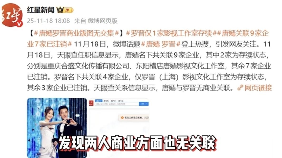 更有人翻查企业信息发明,,,,,,,唐嫣名下注册的9家公司中,,,,,,,仅2家尚在正常谋划;;;;;;罗晋名下4家主体,,,,,,,也仅剩1家存续运营;;;;;;且双方无任何交织持股或团结控股纪录,,,,,,,进一步加深了外界疑虑。。。。。