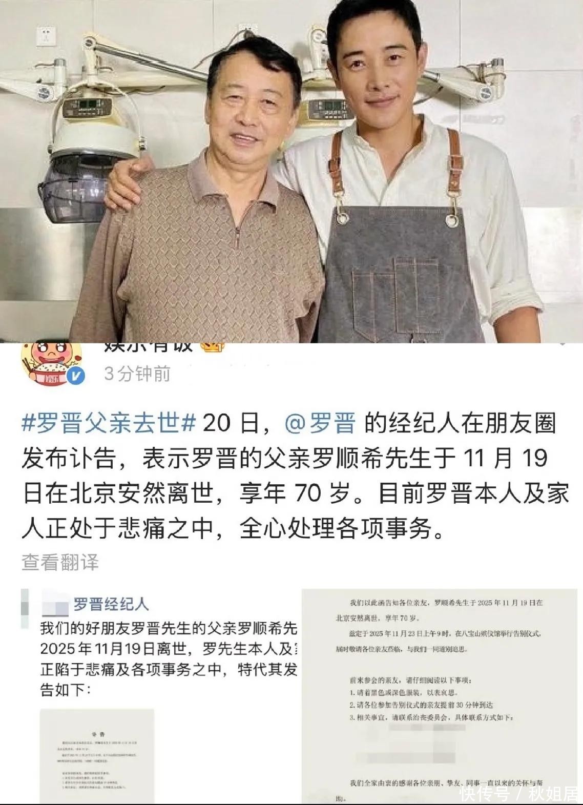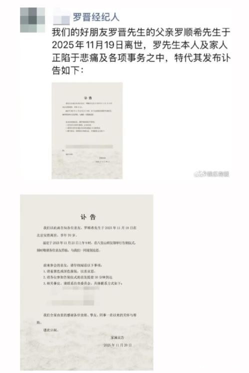 罗晋经纪人于朋侪圈宣布正式讣告,,,,,,,证实其父罗顺希先生因病在北京逝世,,,,,,,享年70岁。。。。。
