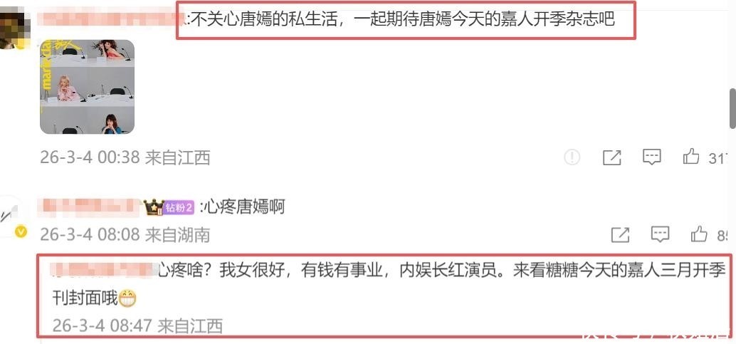 唐嫣粉丝则整体发声:“我们只关注作品与状态,,,,,,,请阻止窥探她的育儿一样平常。。。。。一起期待她今日首发的《嘉人》开季封面!”