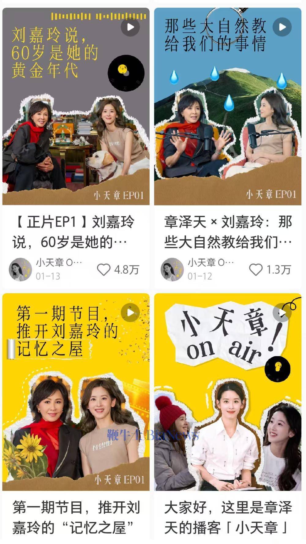 1月13日,,,,,,《小天章》首期正片上线,,,,,,章泽天对话演员刘嘉玲,,,,,,采访内容涉及事业、家庭与人生感悟。。。。。。。。