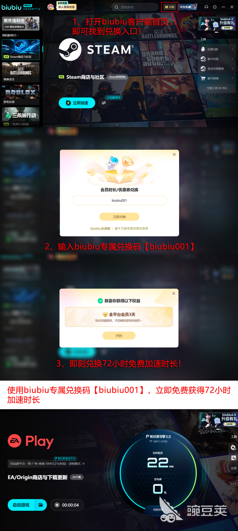 为降低用户试用门槛,,,,,,,biubiu加速器推出分阶段免费体验机制:新用户完成注册后,,,,,,,自动获得24小时全功效加速权限;;;;;首次使用后,,,,,,,输入专属兑换码【biubiu001】,,,,,,,可特殊领取三天加速时长,,,,,,,累计免费体验总时长达96小时。。。。。该战略兼顾用户体验验证与本钱控制,,,,,,,阻止未试用即付费的情形爆发。。。。。